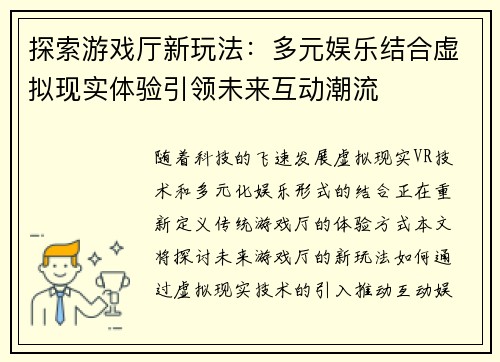 探索游戏厅新玩法:多元娱乐结合虚拟现实体验引领未来互动潮流